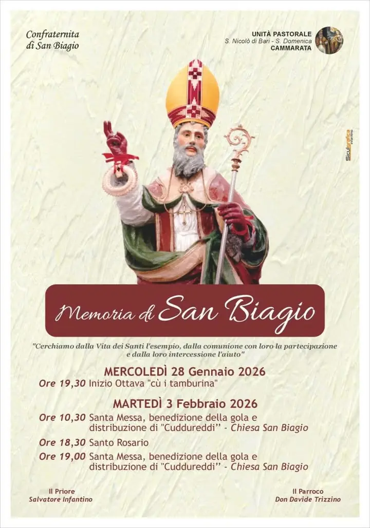 20 GENNAIO– FESTA DI SAN SEBASTIANO, PATRONO DELLA POLIZIA LOCALE. Si svolgerà il 20 gennaio 2026 la tradizionale festa di San Sebastiano, patrono dei Vigili Urbani. La Santa Messa solenne sarà celebrata dall’Arciprete don Davide Trizzino alle ore 11:00 presso la Chiesa di San Sebastiano di Cammarat